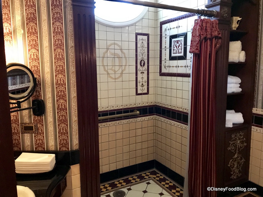 The Frontierland Bathroom is another study in burgundy and beige, with a mix of patterns in the wallpaper and tile.