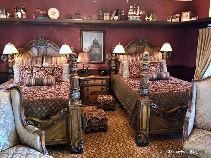 The first of the two bedrooms is the Frontierland Bedroom, a space festooned in deep red and taupe tones, heavy wooden beds, and subtly patterned wallpaper.