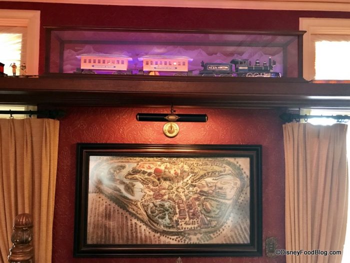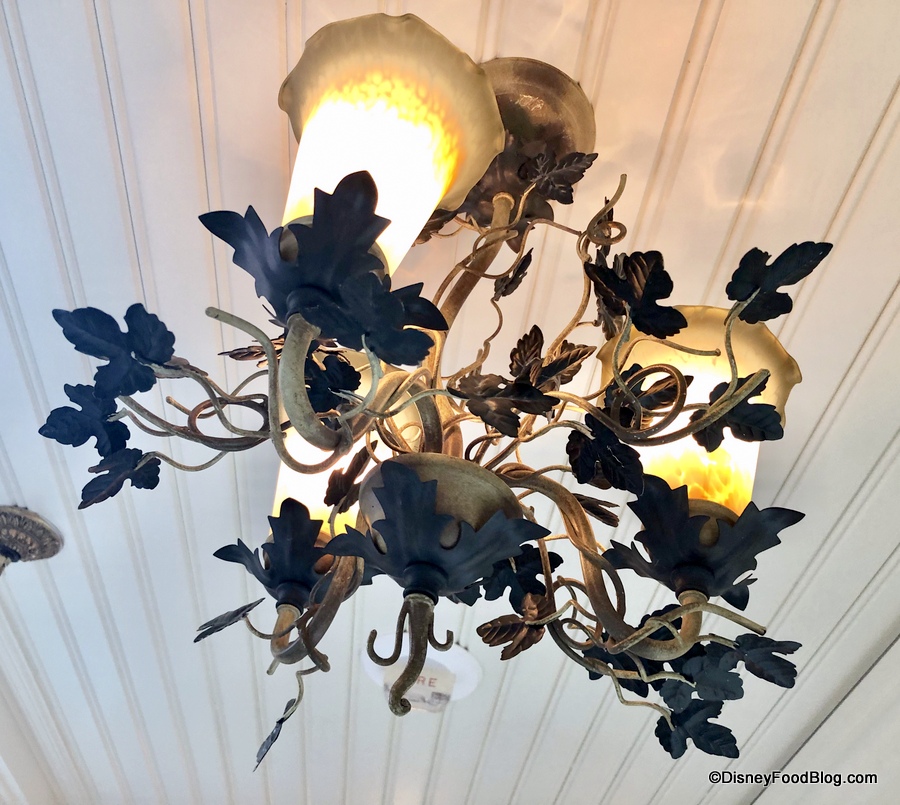 A themed chandelier sheds warm light on the space. Peep those details of spurs and Disneyland Ds! (Sadly they do not sell this in any of the gift shops at Disneyland Park, and what a tragedy that is.)