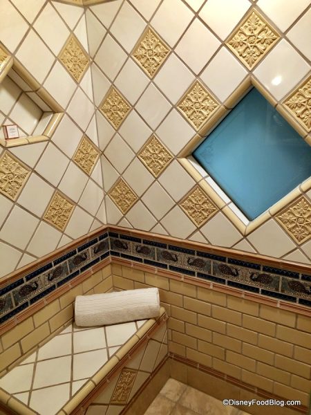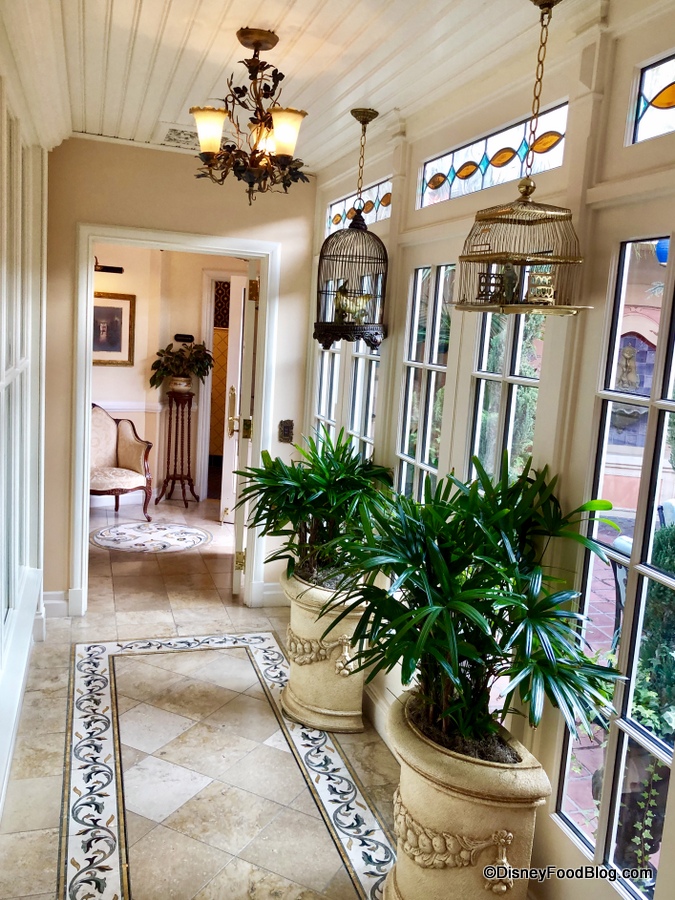 Throughout the Suite there are hallways and pass-throughs that are also decorated to the hilt. In this bright hallway near the Courtyard there are bird cages (we sense a very slight bird theme in the Suite, come to think of it), large plants, and inlaid floor tile.