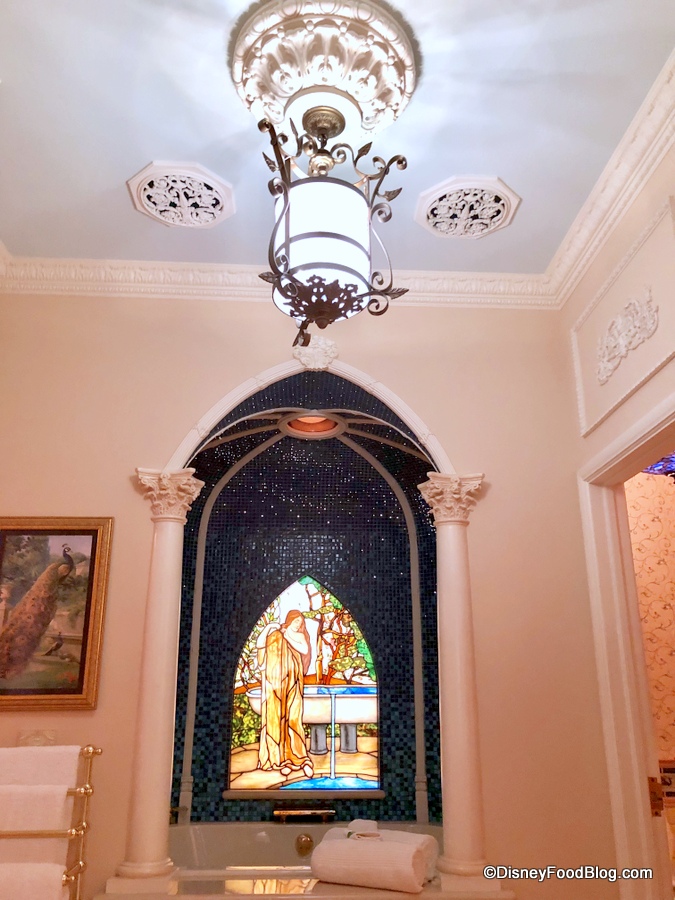 Behind the huge tub in here there’s a stained glass art piece that glows from behind.