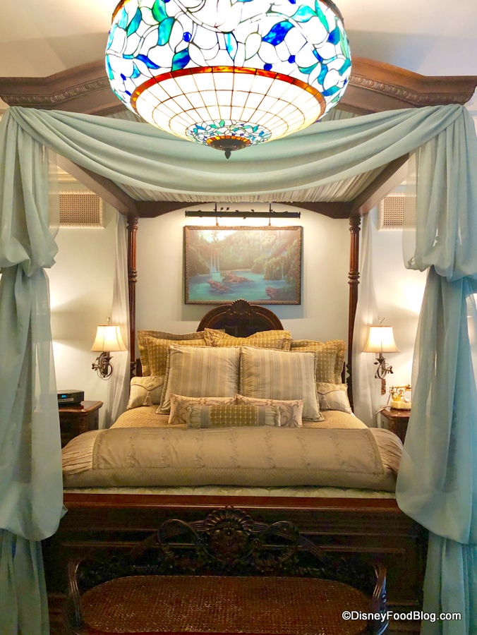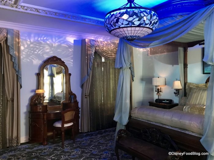 The Master Bedroom is decidedly lighter than the Frontierland Bedroom. The color scheme here is pale blue, rich green (check out that amazing carpet!), and dark metals.