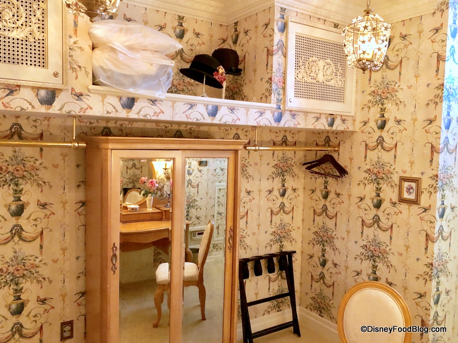 Adjacent to the Master Bedroom is the Dressing Room. This room is wallpaper overload, but if you can get past that, there are some lovely details. Hats rest on stands on the shelf, and shiny light fixtures make getting dressed in here (in theory) a fabulous affair.