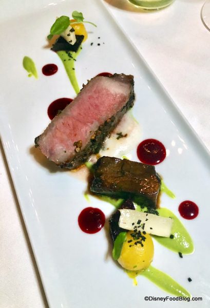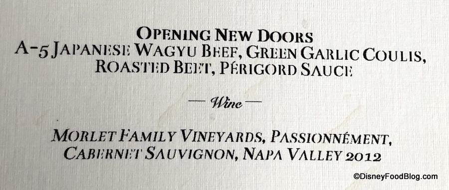 The final savory course was Opening New Doors. What a fantastic and hopeful name for a dish. It consisted of A-5 Japanese Wagyu Beef (a personal favorite of mine), Green Garlic Coulis, Roasted Beet, and Perigord Sauce.