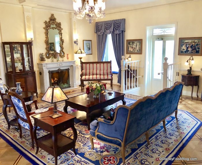 We began in the Parlor, with cocktails in hand, to appreciate the sophisticated and classic design. Heavy blue curtains and ornate ceiling moldings create dimension in a space that is filled with dark wood furnishings, fabulously upholstered couches and chairs, and gorgeous area rug in red, blue, and ivory.