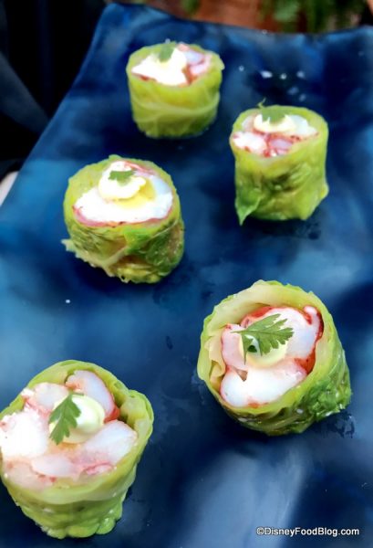 Passed hors d’oeuvres are carefully designed to be easy to hold and eat (you’ll have a Lilly Belle Sour in your other hand, so this is important!). Some, like the seafood cabbage rolls, are slightly larger than a one-bite amuse-bouche, but otherwise, they’re calibrated for ease and enjoyment.