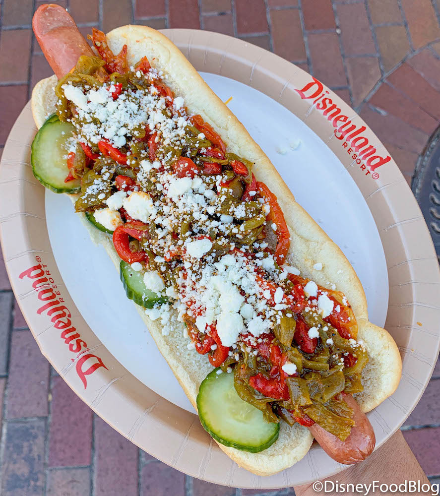 The foot-long all-beef hot dog is topped with harissa aīoli, sauteéd peppers, oven-dried tomatoes, lemon-picked cucumbers, and feta cheese (!!!).