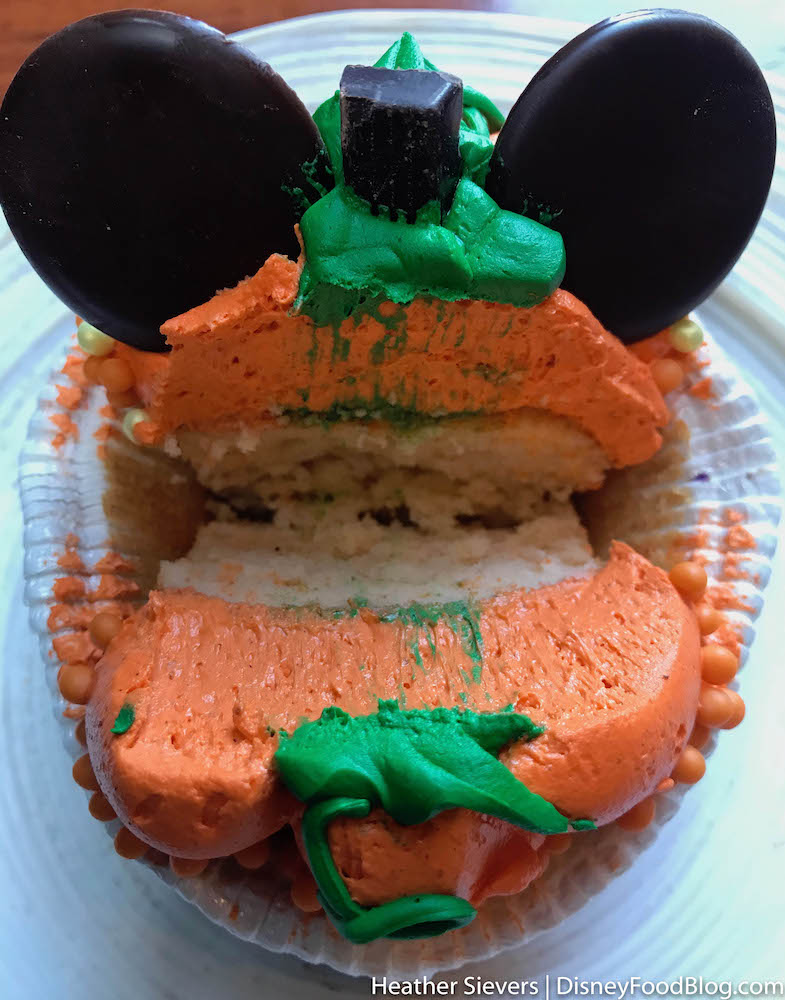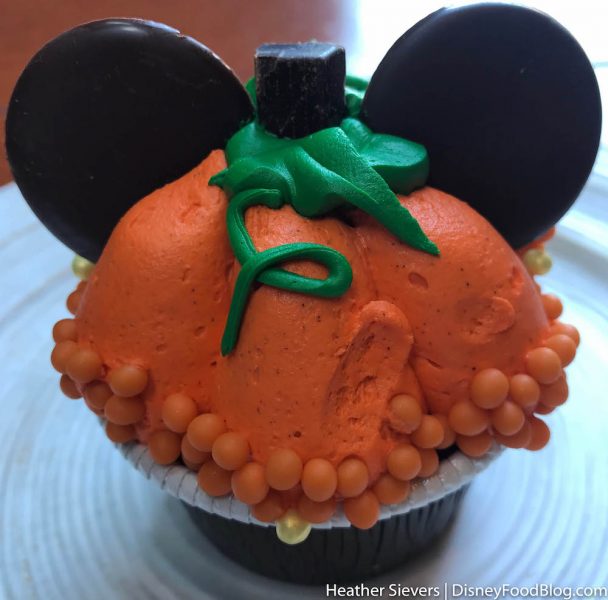 First up, the Mickey Pumpkin Cupcake is a lightly spiced cake topped with pumpkin spice frosting, buttercream frosting, crispy pearls, and chocolate Mickey ear medallions.