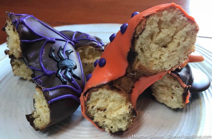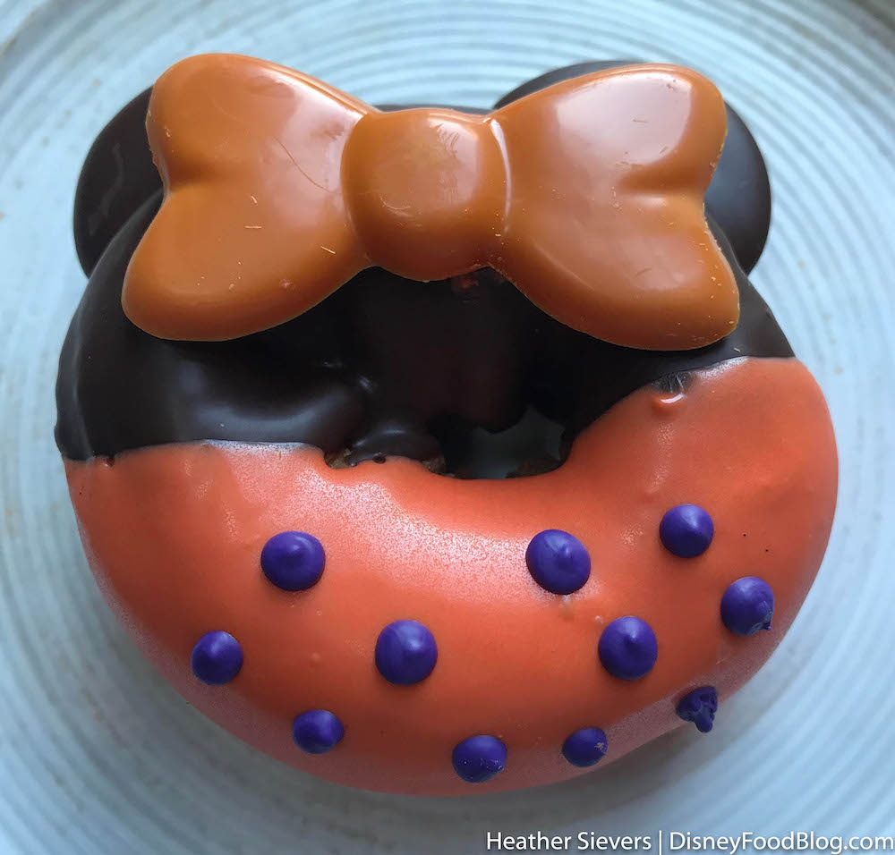 Last, but not least, the Minnie Halloween Donut is topped with chocolate frosting, chocolate and vanilla flood icing, and a chocolate bow. This happened to be our favorite out of the two donuts, just because there were different flood icings on top. A lil bit of vanilla, a lil bit of chocolate, and we’re all set!! Um, plus, has Minnie ever looked CUTER?!