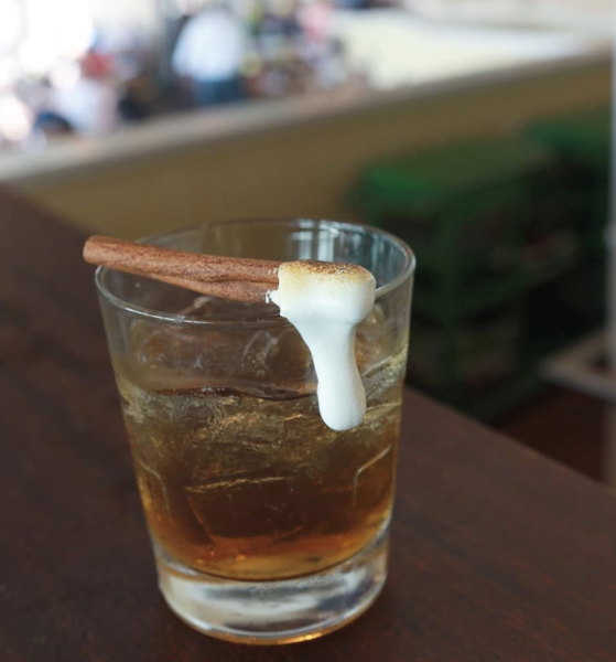 The sweet drink is made with Old Forester Kentucky bourbon, cinnamon bitters, agave nectar, and a cinnamon stick with a torched marshmallow on top for $14!