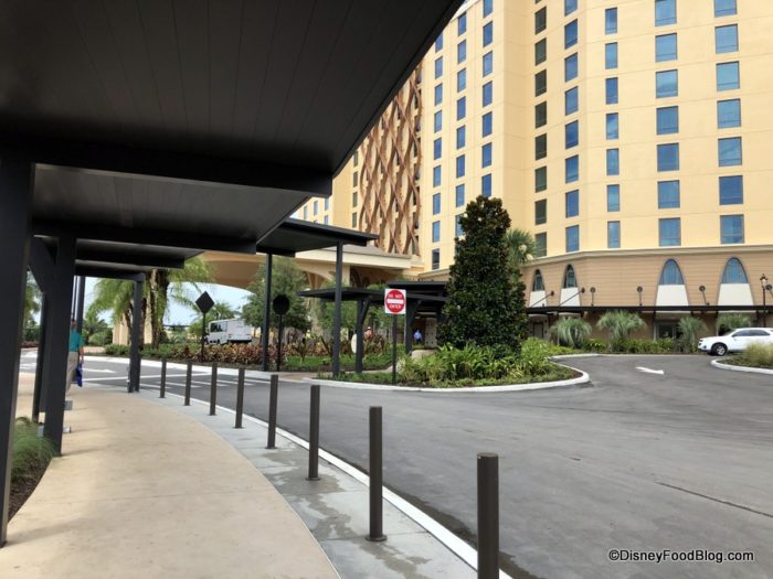 Looking back from the Magical Express bus pick-up area, you can see the Tower and the port cochere.