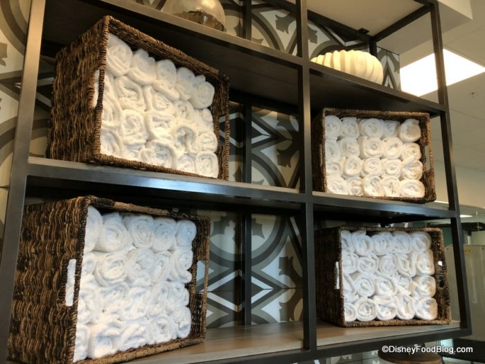 Offerings in the gym include plenty of towels. (Peep that gorgeous Spanish-inspired tile on the wall behind this display!)