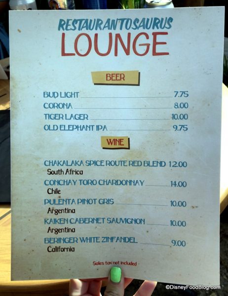 We found a few menu updates over at DinoLand’s Restaurantosaurus Lounge as well. Sweet and Spicy Mixed Nuts are no longer on the menu, and Tiger Lager has replaced the Safari Lager.