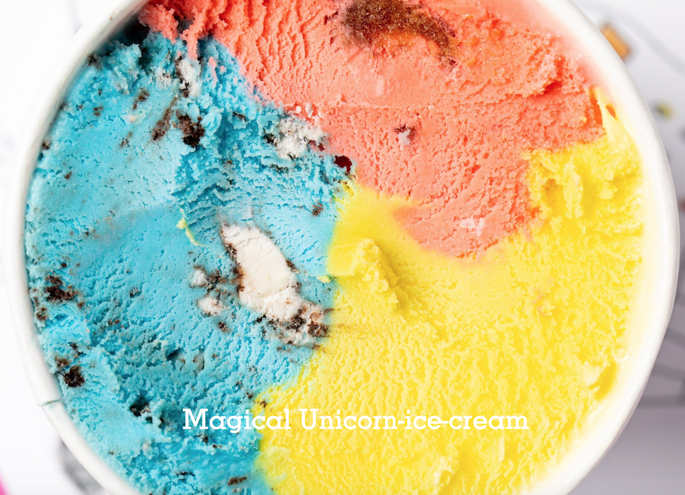 Lookin’ like a colorful candy explosion, the Magical Unicorn-ice-cream channels rainbows and unicorns with its subtly fruity blue, pink, and yellow ice cream mixed with cherries and housemade Oreos.