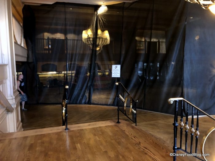 Making our way to Disney’s Yacht Club Resort, the resort’s lobby is undergoing refurbishment. Based on what we heard and saw, it seems like they are replacing or resurfacing the hardwood floors.