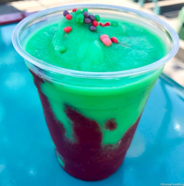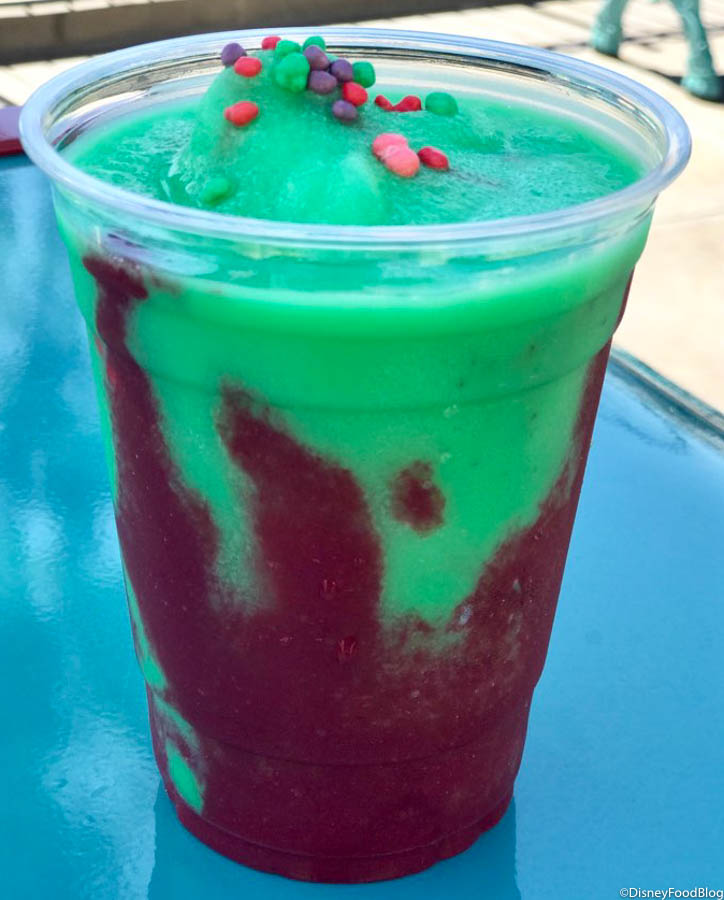 The non-alcoholic version of the Frog’s Breath ($6.00) is a frozen lime and coconut slush with a raspberry swirl and a candy topping.