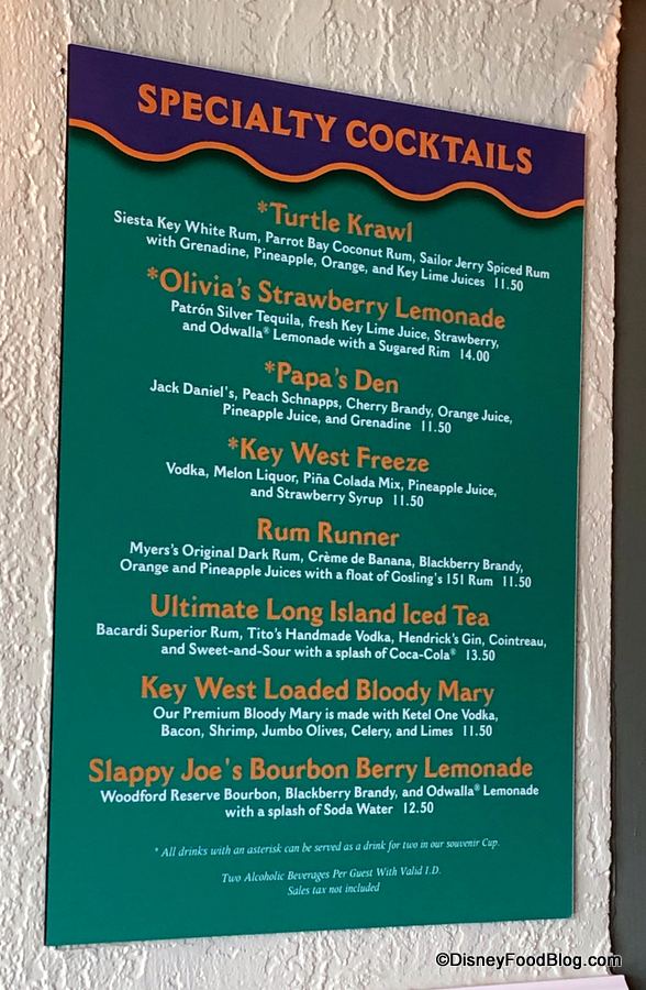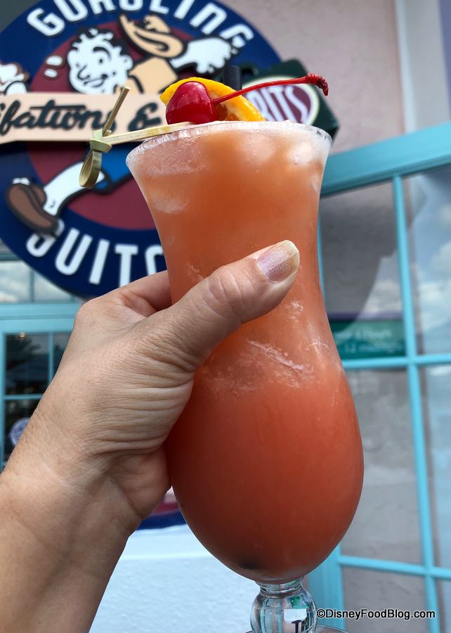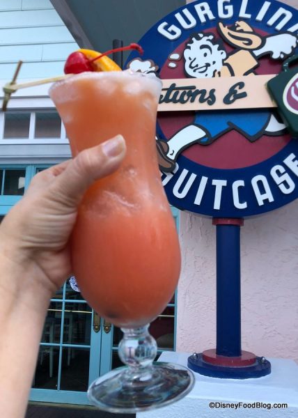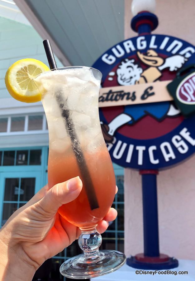 On a recent visit, we spotted a few changes to the Specialty Cocktails Menu. Three drinks were gone — and three more had taken their place. The missing drinks include the Blue Hawai’i, Goombay Splash, and Electric Lemonade. But if one (or all) of those are favorites of yours, the cast members at Gurgling Suitcase say they can still make them — they’re just not featured on the menu any more. So phew! Goombay away, people!