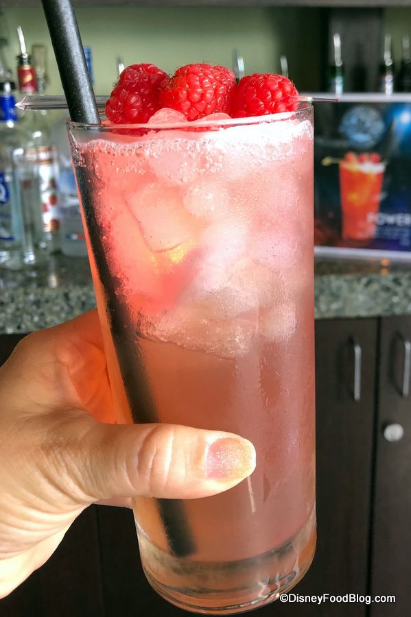 This drink is a balance of tart and sweet and is comprised of tequila, blackberry brandy, sweet-and-sour mix, and agave. It’s $13.50 and served with a souvenir glow cube (just a cube — no special design).