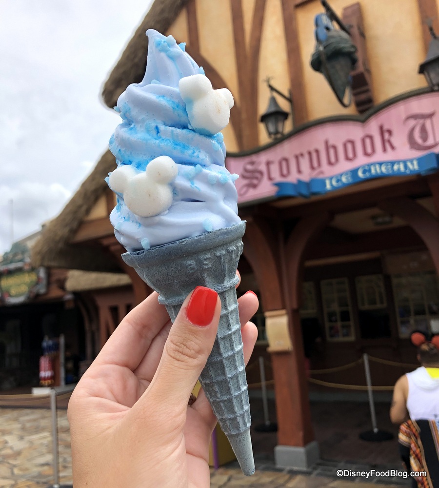The grayish-blue cone is topped with sweet cotton candy soft-serve ice cream, cotton candy sugar sprinkles, and Mickey-shaped sugar cubes!