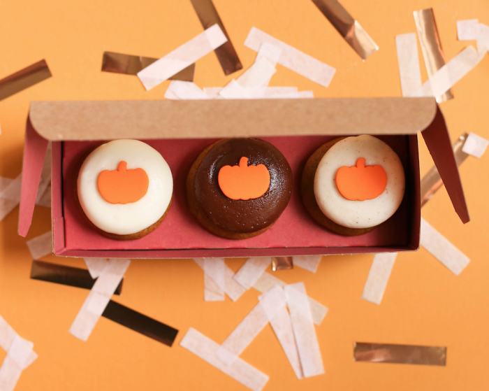 Inside the box, you’ll find three mini Pumpkin Cupcakes with different frostings! You can take a bite of cream cheese, cinnamon cream cheese, and chocolate buttercream on top of the lightly spiced cupcakes! Plus, you’ll receive a FREE sticker sheet with your purchase of the sampler (um, we’re sold).