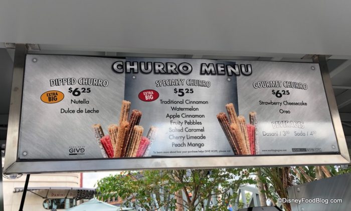 The menu features seven specialty churros — traditional cinnamon, watermelon, apple cinnamon, Fruity Pebbles, salted caramel, cherry limeade, and peach mango ($5.25 each), and two gourmet churros — strawberry cheesecake and Oreo ($6.25). You can also add a dip (Nutella or Dulce de Leche) to a specialty churro for $1 more.