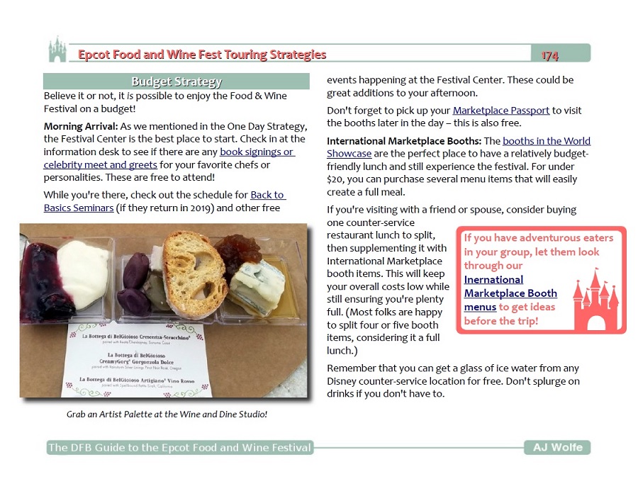 The DFB Guide to the 2019 Epcot Food and Wine Festival is a PDF ebook with 250+ pages of detailed information about the Festival as well as hundreds of photographs and customized bonus items to help you get the best experience possible.