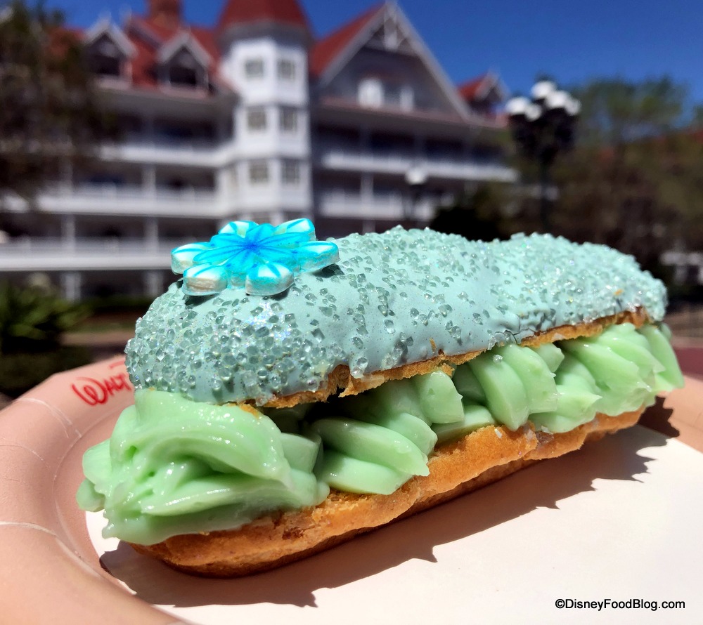 Next door at the Grand Floridian Resort, you can try the Arendelle Aqua Cotton Candy Eclair. The dessert, which we found at Gasparilla Island Grill, is a traditional eclair filled with cotton candy mousse and raspberry curd. It’s topped with white chocolate glaze, sugar sprinkles, and a white chocolate snowflake decoration.