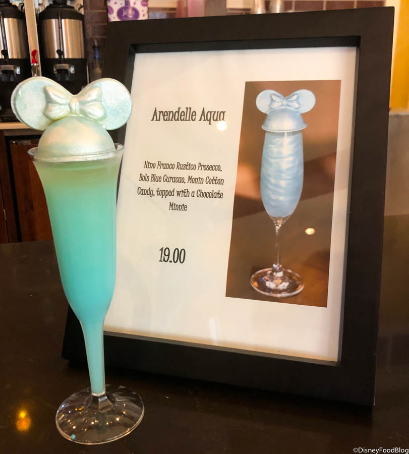 In Disney Springs, Amorette’s Patisserie is offering what they call the Arendelle Aqua drink, which is made with Nino Franco Rustico Prosecco, Bols Blue Curaçao, and Monin Cotton Candy. And it’s topped with shimmery white chocolate Minnie ears.