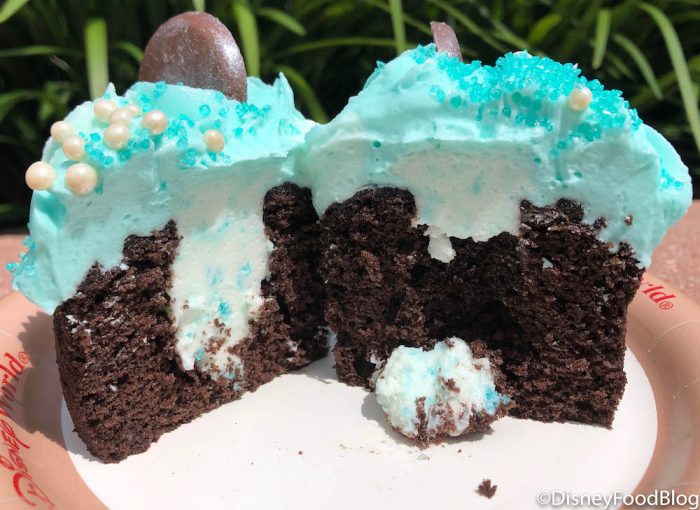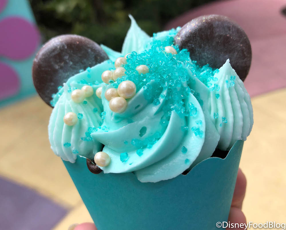 Disney’s Pop Century Resort is home to the Aqua Pearl Cupcake, which consists of chocolate cake, blue cotton candy marshmallow filling, cotton candy buttercream frosting, milk chocolate ears, crispy pearls, sugar, and glitter.