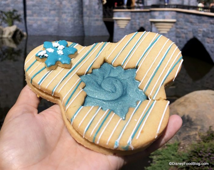 At Disneyland’s Market House, you can grab the Arendelle Aqua Linzer Cookie, which is a Mickey-shaped cookie with mixed berry jam and white chocolate drizzle.