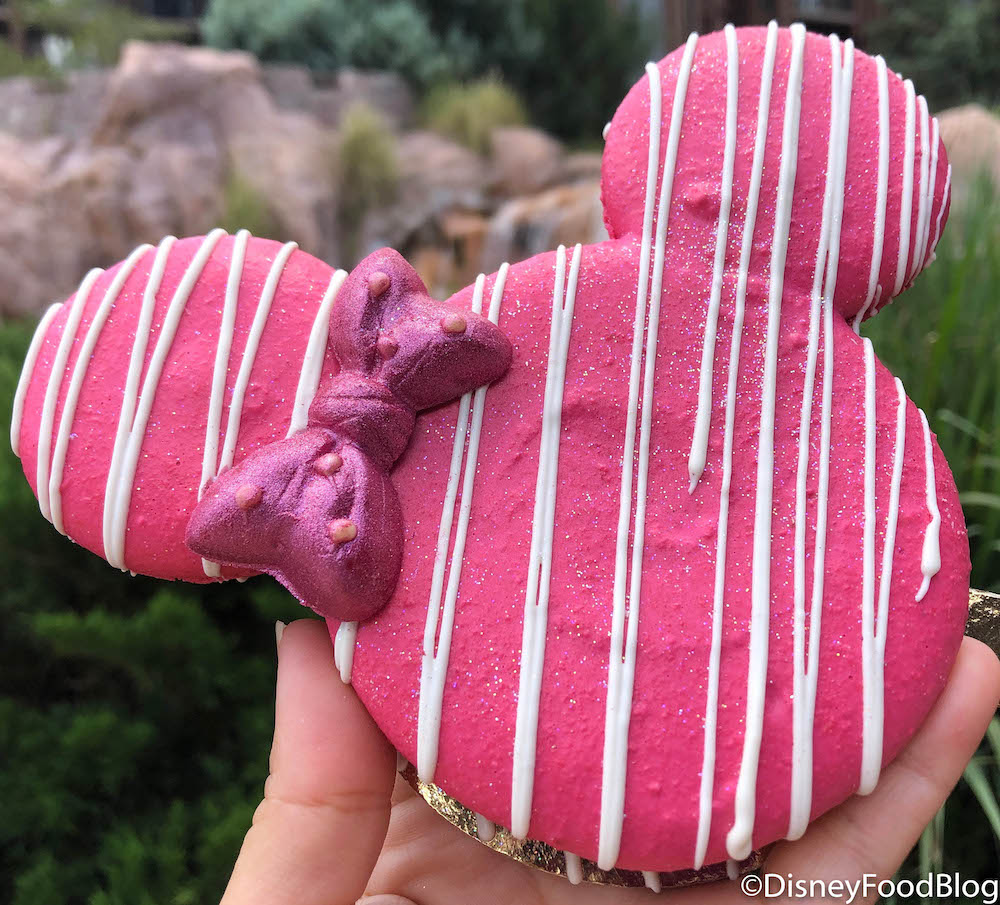 The raspberry macaron has a raspberry lemonade filling, a white chocolate Minnie bow, icing drizzle, and dusted edible glitter.
