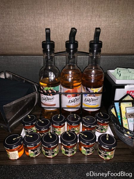 On the hot bar, we found Coffee — regular and decaf — along with extras like honey and flavored syrups.