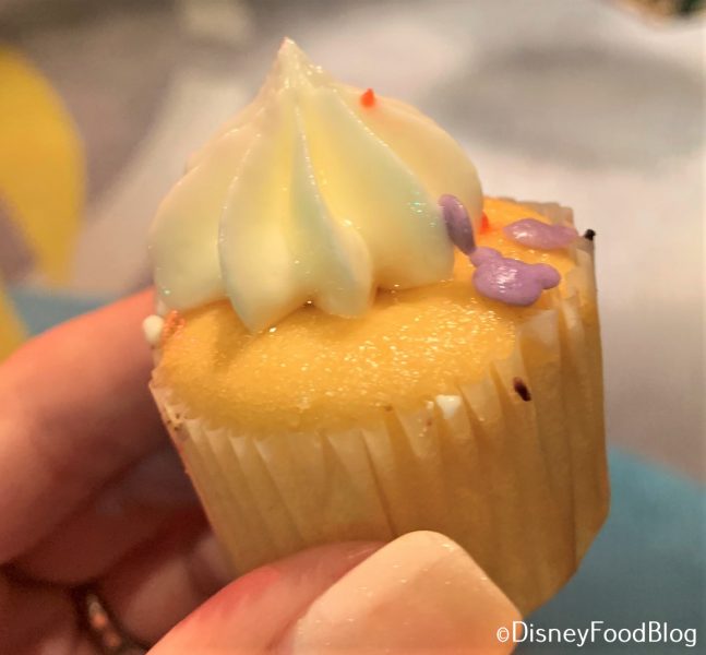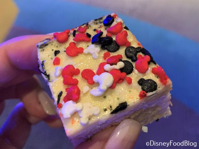 Lastly, the bite-sized Rice Krispie Treats! They are standard (read: delicious) Disney Rice Krispie Treats, pre-cut into bite-sized squares and topped with a thin layer of vanilla frosting and pirate-colored sprinkles.