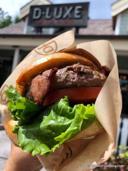 D-Luxe’s signature beef patty was piled high with smoked sausage, shreds of braised red cabbage, lettuce, tomato, grilled onion, and stout cheese sauce all on a fresh-baked Parker House roll.