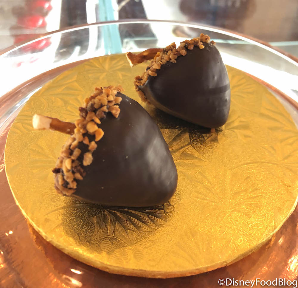 You get 2 dark chocolate-dipped strawberries with toasted candied hazelnuts and a pretzel stem for $6.