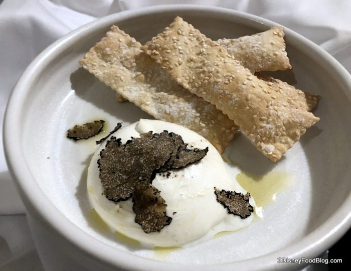 While we didn’t get to try it, the Burrata looked yummy as well! It features Burrata cheese, Black Winter truffles, Olio d’ Olivia, and seed lavosh. Look at those shaved truffled on top!! YUM.