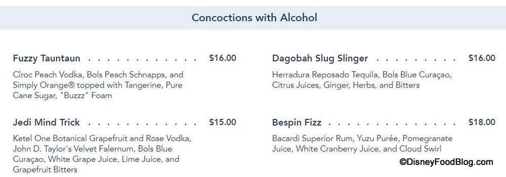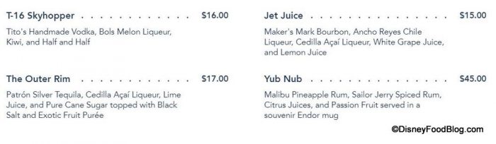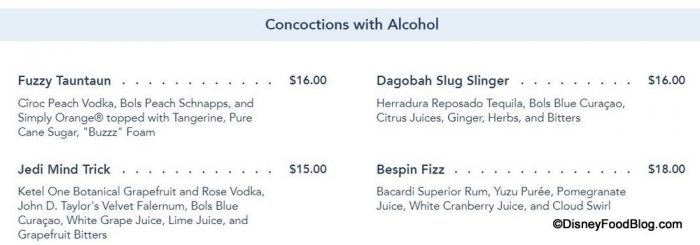 As far as we know, the non-alcoholic drinks have not experienced price increases in Disneyland, but MANY of Oga’s alcoholic concoctions have. The Fuzzy Tauntaun, Dagobah Slug Slinger, Jedi Mind Trick, and Bespin Fizz have ALL increased by one dollar to match their Disney World counterparts.