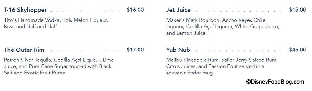 The Outer Rim, T-16 Skyhopper, and Jet Juice have seen dollar price increases as well, while the Yub Nub, which comes in a souvenir Endor mug now costs $45 instead of $42.