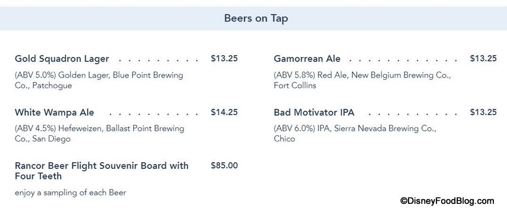 All beers are now $1.25 more than they were when they debuted, and the Rancor Beer Flight Souvenir Board has increased in price by a whopping $10! (For the record, the souvenir board was already $85 when it arrived in Disney World.)