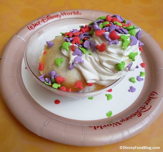 Over at the Land Pavilion, Sunshine Seasons is offering this Vanilla Gelato Sundae topped with Mickey-shaped multicolored sprinkles!