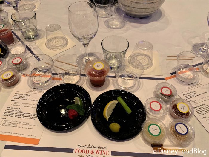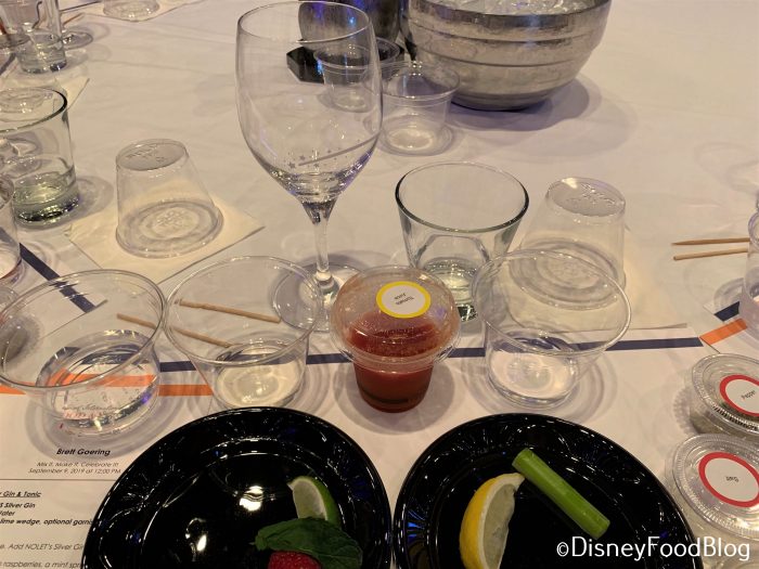 At each setting, there were several empty cups and glasses (soon to be full), as well as pre-measured amounts of gin, vodka, tonic water, and tomato juice. (I bet you can guess the cocktails we’re going to make!)