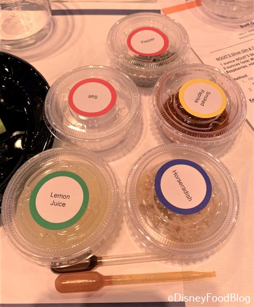 Each person also received little containers of Horseradish, Lemon Juice, Smoked Paprika, Salt, and Pepper, as well as pipettes of Tabasco Hot Sauce and Worcestershire Sauce.