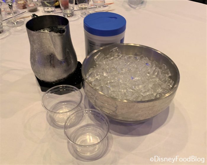 Lastly, in the center of each table were ice buckets and pitchers of water. The ice is intended for the cocktails, as well as ice water should you want some.