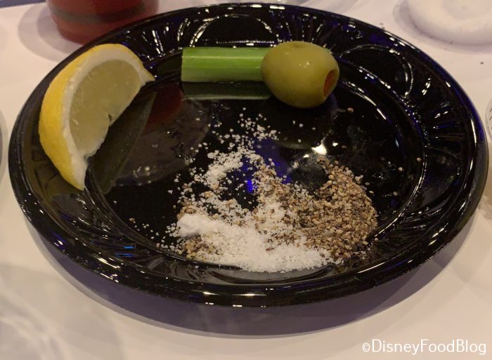 We also had two plates with garnishes — one had a raspberry, mint leaf, and lime, and the other had celery, lemon, and an olive.