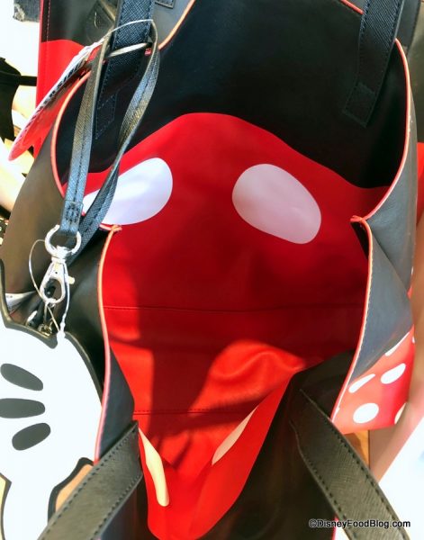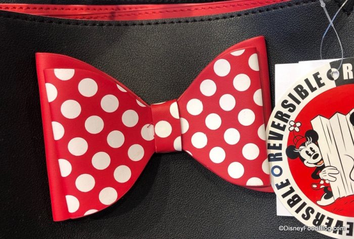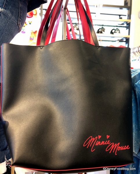 We’ve spotted two red-and-black tote bag designs around the World, including this solid black version with graphic Minnie touches. The polka dot bow is a girl’s best friend.