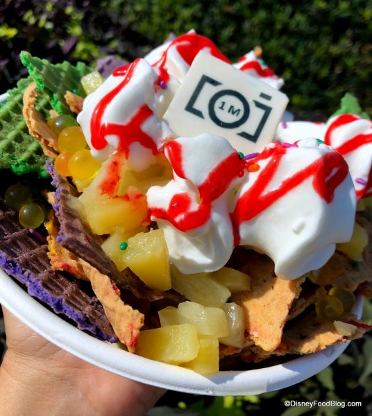 The nachos themselves are (funfetti and traditional) waffle cone chips colored purple, green, and brown. The “nachos” are topped with a generous swirl of vanilla and pineapple Dole Whip, pineapple tidbits, mango Boba balls, whipped cream, strawberry drizzle, sprinkles, AND a white chocolate 1 million camera piece!