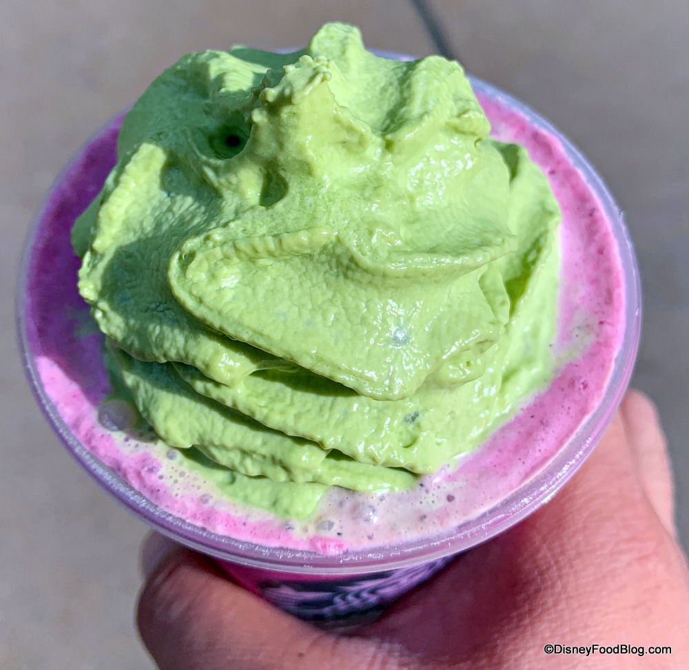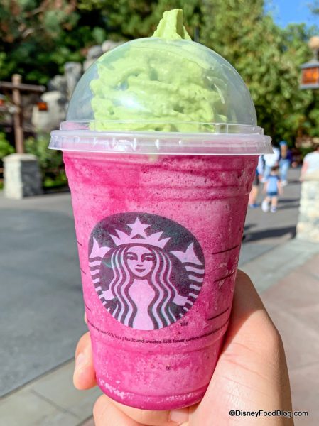We first tried the Maleficent Frappuccino — a blueberry and vanilla bean creme frappuccino blended with diced dragon fruit and topped with matcha tea whipped cream.