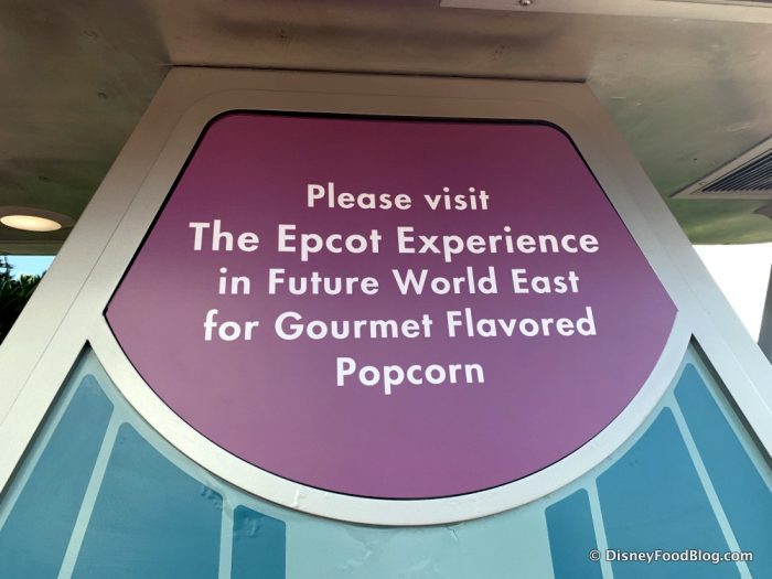 A sign on the Gourmet Popcorn Cart said to visit the new Epcot Experience, which just opened today over in the Odyssey Center, for all our gourmet popcorn needs.