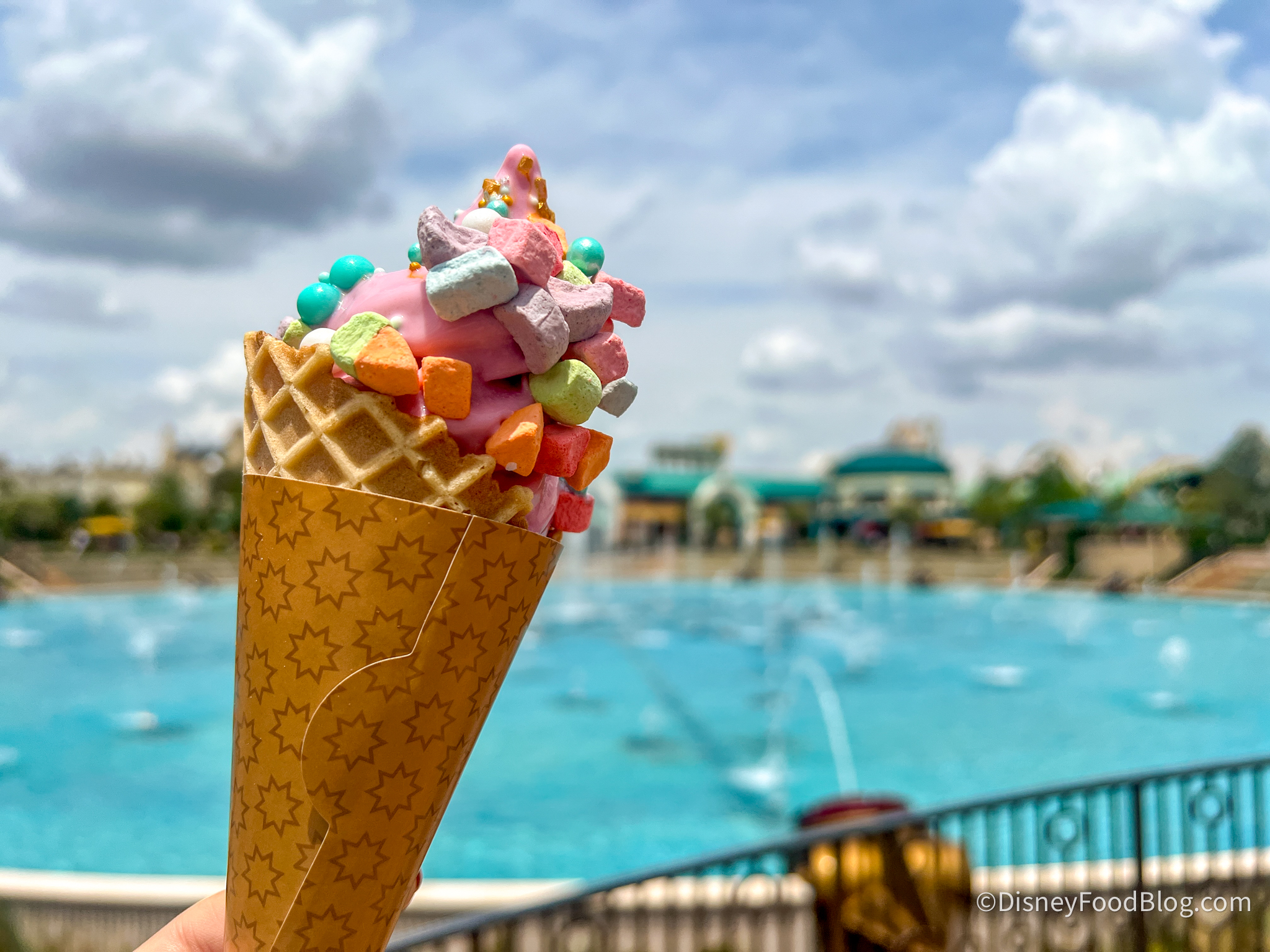 First, we’re gonna try Cool Wash’s Assorted Coca-Cola Slushies (non-alcoholic) which include special mix-ins such as Spice Drops, Candy Pebbles, Boba Pearls, and Pop Rocks! Note there are NO swedish fish…which is what Disney said would be here when they announced the booth…and we are seriously UNHAPPY ABOUT THE LACK OF SWEDISH FISH.
