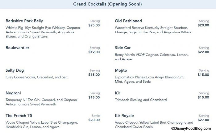 You’ll also be able to choose between several Grand Cocktails, which are priced per serving. The Negroni, Mojito, and Kir Royal sound yummy to us!